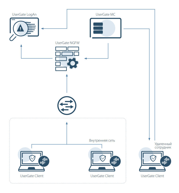 Агент безопасности UserGate Client объединяет функционал систем Endpoint Detection & Response (EDR), защищенного соединения (VPN) и контроля доступа (NAC), позволяя создать интегрированную систему отслеживания, управления и расширенной защиты конечных точек, входящих в корпоративную сеть, и обеспечить надежную защиту IТ-ресурсов. Основные задачи UserGate Client - регистрация событий безопасности, контроль состояния и организация cетевого доступа с нулевым доверием (Zero Trust Network Access, ZTNA), фильтрация вредоносных и запрещенных сайтов, защита сетевых соединений. UserGate Client внесен в реестр российского программного обеспечения, запись в реестре 13087.